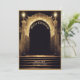 Mörk God jul-kort med en spooky gyllene kyrkogård med lyktor och ornat grind entrance.
