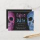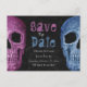 Det gotiska skallhuvudet sparar datumet. Roligt rosa, blått, svart vintage stil Halloween bröllop-vykort för meddelande. Spooky Hallobröllopsdesign. Tills döden gör oss del-typografi. Upphovsrätt Marg Seregelyi Fotography.