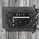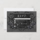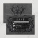 Transportera dina gäster till en värld av mörk, och njuta av elegans med vårt vintage gothic bröllop-svarskort. Den djupa, svarta bakgrunden för åldras anger scenen för en slående kontrast, eftersom fetstil för vit text kommer från komplicerade svarta textrutor. I höjdpunkten på inbjudan fångas det centrala i mystik och romantik av en tredimensionell gothisk gräns med en regal svart korv. Baksidan är försedd med två sammanflätade vindruvor av svart ro som subtilt bildar ett hjärta runt två omfamnande ravens, vilket tillför en aning dramatisk allure. Släpp magin och ange tonen för en oförglömlig bröllopsdag. Kortet är en del av Gothic Black Raven & Black Ro Bröllop Suite skapat av enbart Farmhouse Press.