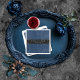 Transponera dina gäster till en värld av mörk, förtrollande elegans med vår vintage gotiska bröllopsservett för drinkar. Den djupa, åldrande kungliga blå bakgrunden sätter scenen för en slående kontrast, då fet vit text framträder från en invecklad svart textruta med parets namn. Denna design fångar essensen av mystik och romantik. Lås upp magin och sätt tonen för en oförglömlig bröllopsdag. Skapad av Simply Farmhouse Press.