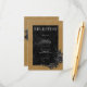 Transporter dina gäster till en värld av mörk, förtrollande elegans med vårt vintage gotiska bröllopsinbjudningskort. Den åldriga viktorianska guld-bakgrunden sätter scenen för en slående kontrast, då fet vit text framträder från invecklad svarta textrutor. Högst upp på inbjudan fångar en tredimensionell gotisk ram dekorerad med en kunglig svart korp essensen av mystik och romantik. Baksidan är prydd med två sammanflätade vinrankor av svarta rosor som subtilt formar ett hjärta runt två omfammande korpar, vilket ger en dramatisk allure. Låsa upp magin och ställ in tonen för en oförglömlig bröllopsdag. Detta kort är en del av det gotiska svarta korp- och svarta ros-guld br