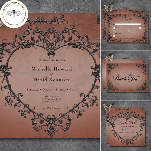 Gothic Black & Rust Filigree Heart Bröllop Inbjudningar