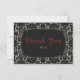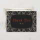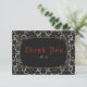 De här 5-tums x 3,5-tums bröllop-tackkorten har ett gotiskt stil med svart och benfaux snöre mot svart bakgrund. Baksidan har väst pappert och ett gräns med platshållare för det gifta paret namn, hälsning och ett valfritt budskap.