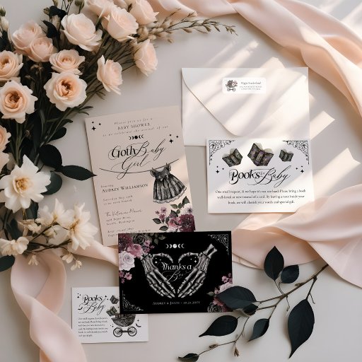 Vårt gotiska Halloween-skelett med baby i händer i hjärtat är perfekten för det moderna mor som vill vara med och som har en unik och edgy estetik för sin babydusch firande. Vår design har vårt handmålade vattenfärgsskelett händer som skapar ett hjärta och våra handmålade vattenfärgsgotiska blommigtar. Design fångar kärnan i ett sött mystiskt och charmerande gotskt tema. Där elegans möter en viskare av den mystiska och gotiska charmen, skapar perfektens lockelse till din lilla ankomst. Ursprungligt handritat vattenfärgsgrafik och design av Moodthology Papery.