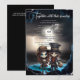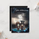 At the heart of this striking invitation is an illustration of a skeleton bride and groom, standing side by side in a sombre manner that radiates both goth romance and eerie sophistication. They stand against a backdrop of lightning lit stormy skies out at sea and at the entrance to an ominous cave. Bio luminescent water glows a dramatic blue at their feet as they enter the realms of the unknown, enhancing the overall sense of grandeur and mystery.