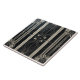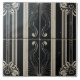 Art Deco-keramiskt plattor med fyra svarta och vita plattor med blommigt och geometriskt mönster, placerade i en kvadratisk, symmetrisk utformning, upplagd med lodrät vitt linjer med varierande tjocklek och blommigt inslag, vintage stil, dekorativ, elegant, minimalistisk.