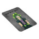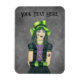 Den här flexibla magneten har en skämtsam gotisk flicka med grönt och svart hår med en grönt hatt, fingerlösa handskar och svart klänning med spindelnät och måne tatuering på mörkens grått-bakgrund. Anpassa texten med mallen.