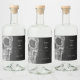 Tema Gothic Halloween bröllop. Macabre coola grunge struktur svart och vit tryckt halshuvudets liquor flaska etiketter. Spooky, läskigt, ondskefullt, ondskefullt. Personlig Goth-typografi, trendig, unik, modern, skrämmande design. Upphovsrätt Marg Seregelyi Fotography.