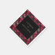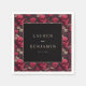 This wedding napkin design features a bold black square frame with elegant gold text, surrounded by a striking pattern of red skulls and floral motifs on a dark background. The color palette includes deep reds, blacks, and luxurious golds, creating an edgy yet romantic aesthetic that blends gothic elements with traditional beauty. The detailed digital illustration showcases realistic shading and highlights, giving the skulls a three-dimensional appearance against the soft floral designs. With customizable placeholder text for names and dates, this design is perfect for couples seeking a unique and memorable look for their special day, evoking a mood of mystery, romance, and sophistication.