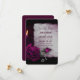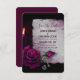 Bröllop spara datum-kort med ett bra utseende. Ett gammalt betesområde pappert med tips om lila-rött. En magenta ro i fullt blomning, en rosenknopp, ett ljus och ett silver-skåp på en mörk burgundisk bakgrund skapar ett vackert och mystiskt goteskt kort för att spara datumkortet.