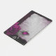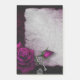 Stora post-it-anteckningar med ett bra utseende. Ett gammalt betesområde pappert med tips om lila-röd runt kant. En magenta ro i fullt blomning, en rosenknopp, ett ljus och ett silver-skåp på en mörkens burgundbakgrund skapar en vacker, mörk och mystisk gotisk design.