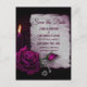 Bröllop spara datum vykort. Designad med ett bra utseende. Ett gammalt betesområde pappert med tips om lila-röd runt kant. En magenta ro i fullt blomning, en rosenknopp, ett ljus och ett silver-skåp på en mörk burgundisk bakgrund skapar ett vackert och mystiskt sparande av datumkortet.