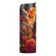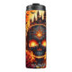 Den här goda illustrationen har en stor, svårskalad skalle med glödande ögon och ett leende. Den omges av lush röd ros och ett läskigt slottsilhuett mot en massiv, grym orange måne. Fladdermus flyger i himmel med snurrande moln, skapar en vackert mörk och romantisk Halloween-scen.