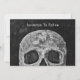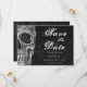 Gummiskalle Spara datumsvart och vit vintage stil Hallobröllopsinbjudan med platta kort. Roligt, spooky Halloweeen goth to Death Do oss Part script. Upphovsrätt Marg Seregelyi Fotography.