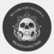 En skalle och ornera gräns mot svart bakgrund, och "Vi ber dig att ha en Bra med fickor" eller valfri ordalydelse, i chic vita bokstäver på dessa rundklistermärken i Halloween fest som finns i två storlekar och flera stilar. MATCHING-objekt i vår butik.