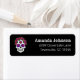 Dessa returetiketter har en blommigt skalle med ro på huvudet och ögon, med anpassade för namn och adress över en svart bakgrund.