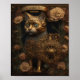 Guld steampunk gothisk katt, blommor och växlar digital AI-grafik.