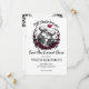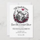 Meddela ditt eviga engagemang och be dina gäster markera sina kalendrar med det här fantastiska gotkortet "Spara datumet". Konstruktionen har det ikoniska skelettparet "Till döden Do Us Part" i ett evigt omfamnande, omgivet av djupa crimson ro och torniga vinstockar. Perfekt för ett gotiskt, alternativt eller Halloween bröllop, ger det här kortet perfekten makaber men romantisk ton för dina kommande påhitt. Anpassa helt enkelt till namn och bröllop-datumet och tala om för alla att en formell inbjudan kommer att följa.