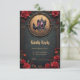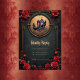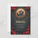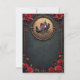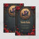Gothic Carriage with Ravens and Ro. En gothic-stil-vagn dras av två avn med top hat i en golden cirkel i ram. Godset är prydat med blommor och har en kor överst. Bakgrunden är en mörk, en texturerad grönt, och ram omges av röd ros och dekorativa guldblomningar. Den allmänna stämningen är mörk, elegant och något vismisk.