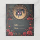 Gothic Carriage with Ravens and Ro. En gothic-stil-vagn dras av två avn med top hat i en golden cirkel i ram. Godset är prydat med blommor och har en kor överst. Bakgrunden är en mörk, en texturerad grönt, och ram omges av röd ros och dekorativa guldblomningar. Den allmänna stämningen är mörk, elegant och något vismisk.
