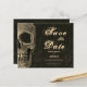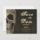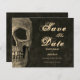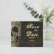 Gotisk halvt kranium vintage sepia budget Spara datum platt kort inbjudan. Roligt, kusligt Halloween Tills döden skiljer oss åt skript på texturerad bakgrund på baksidan. Bild copyright Marg Seregelyi Photography.