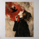 En hypnotisk gotisk surrealistisk porträtt av en kvinna i en elegant svart klänning, som delar en mystisk stund med en svart korp. Kompositionen framhävs av en dramatisk karmosinröd stänk mot en väderbiten, vintage-strukturerad bakgrund. Denna konst väcker teman om mörk fantasi, poetisk ensamhet och mystisk förbindelse. En idealisk mittpunkt för fans av mörk akademi, gotisk inredning och avantgardistisk finkonst.