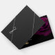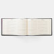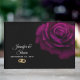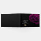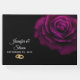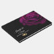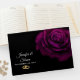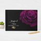 En bröllopsgästbok med en närbild av en gotiskt utseende lila magenta ros. En mörk och mystisk stil. 2 gyllene vigselringar under den personliga texten.