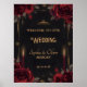 Välkommen gäster med dramatisk elegans med denna gotiska mörka romantiska bröllopsväxlingsskylt, med djup svart bakgrund, eleganta rika röda rosor och ljus, modern typografi . Perfekt för gotiska, mörkt romantiska och stämningsfulla bröllopsceremonier.