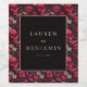 Denna etikett för bröllopsvin har en elegant design med en central svart fyrkant omgiven av intrikata röda blomsterornament och subtila dödskalle-accenter, vilket skapar ett gotiskt men ändå romantiskt tema. Färgpaletten omfattar djupa röda toner, burgunderröda och svarta, kompletterade med dämpad guldbokstav i ett klassiskt serif-teckensnitt som tillför sofistikation. Perfekt för formella firanden kombinerar denna etikett makabra element med utsmyckade blommor för att förmedla en stämning av mystik och förfining, vilket gör den idealisk för dem som söker en unik och stilren touch för sin speciella dag.
