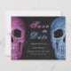 Gothic halvt kranium Save The Date. Roligt rosa, blått, svart vintage stil Hallowedding-inbjudan platt kort. Skräckinjagande Halloween bröllop gotisk Till döden skiljer oss åt text. Bild copyright Marg Seregelyi Photography.