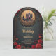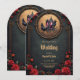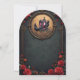 Gotisk vagn med korpar och rosor. En gotiskt inspirerad vagn som dras av två korpar med topphattar, placerad i en utsmyckad, gyllene cirkulär ram. Vagnen är dekorerad med blommor och har ett kors på toppen. Bakgrunden är en mörk, texturerad grön färg, och ramen är omgiven av röda rosor och dekorativa gyllene detaljer. Det övergripande stämningen är mörk, elegant och lite fantasifull.