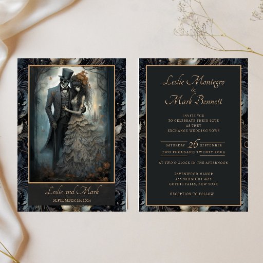 Abstrakt gotiskt blommönster som matchar skelettbröllopsinbjudningar för brud och brudgum.