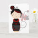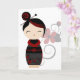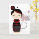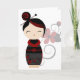 Denna Kokeshi ha på sig en kolkimono med blommatrycket. Hon kimonoen har blommor och virvlar runt med rött sy.