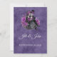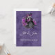 Gotiskt skelett bröllopsinbjudan, en elegant och makaber bröllopsinbjudan med en skelettbrud och -brudgum som dansar mot en djup lila bakgrund med utsmyckade gotiska detaljer.