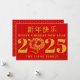 Guld fet typografi Gott kinesiskt nyår för ormens år Julkort. Detta vykort firar det kinesiska nyåret för ormens år med iögonfallande fet typografi. Det visar hälsningen "Gott nytt år" på både förenklad kinesiska och engelska, med årtalet 2025, där en orm kreativt ersätter nollan, allt vackert visat i guld på en livfull röd bakgrund. Baksidan av kortet är prydd med ett lockande mönster av guld diamantformar i samma röda, vilket ökar dess praktfulla charm och gör det till en idealisk högtidlig hälsning.