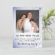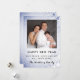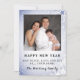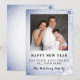 Fira det nya året genom att skicka ut en hälsning för att önka fred, kärlek och glädje till alla. Gott nytt år med familjefotot. Ändra detta för ditt eget. Personifiera ditt namn och din hälsning. Den blå snöscenen fortsätter på baksidan.