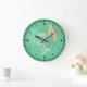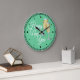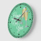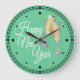 Den här nyårs-klockan visar två glas champagne, färgglad konfetti och texten: Gott Nytt År allt på en grön bakgrund. Bakgrundsfärgen kan ändras genom att välja knappen Anpassa och sedan redigera.