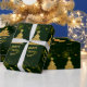 En vacker jul Julhälsningar med gnistrande glitter Julgran och ljus på gröntens bakgrund.