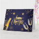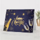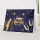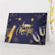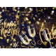 En festlig nyårsfirande scen med en gnistrande champagneflaska och två glas fyllda med bubbel. Bakgrunden är en djup marinblå färg prydd med gyllene stjärnor, skimrande konfetti och cirkulära mönster.