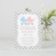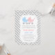 En elegant och klassisk inbjudan till tvillingbarnkalas för blivande mammor som väntar tvillingpojke och -flicka. Den har en rosa och en blå barnvagn med prickmönster. Bakgrund med grått och vitt chevronmönster. Personalisera enkelt med din festinformation.