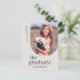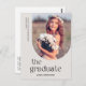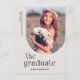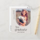 Den här moderna examenskortet har elegant typografi och en ur-center, upp och ner vänd bågformad fotoram. På framsidan står "Den utexaminerade" skriven i ett enkelt och trendigt teckensnitt nedanför fotot. Den utexaminerades namn är centrerat under typografin, medan den utexaminerades skola och examenår står skrivet vertikalt längs med vänster sida av fotot. Typografin är kolgrå mot en ljusgrå bakgrund. På baksidan av examenshälsningen kan du lägga till ett meddelande till mottagarna och/eller information om festsammanträdet.