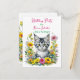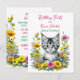 En söt liten grårandig kattunge i en säng av gula och rosa blommor akvarell illustration flickas födelsedagsfest inbjudningar.