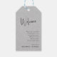 Välkommen bröllopspresenttagg, fantasifull minimalistisk modern, anpassningsbar vit skrifttypografi. Den ljusgrå linnetryckta texturen ger en touch av organiskt känsla och klassisk elegans. Andra färger finns tillgängliga.