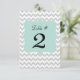 Stilrent platt stil bordnummerkort för bröllopsfesten gjort i ett trendigt ljust grått och vitt chevron sicksack-mönster. Ett mintgrönt dekorativt textområde har svart text som är redo att anpassas. Anpassa texten på framsidan och baksidan för varje bord på er fest.