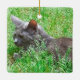 Detta objekt visar en fotografera av en grå tortiekatt som vilar i gräset.