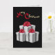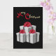 Grå och vita presenter med stora röda slingor gör ett vackert motiv för dina julinbjudningar. Presenterna sticker ut mot den svarta bakgrunden. Röda och gyllene bokstäver ger en julstämning! Baksidan är grå och vit randig. Anpassa den med ditt meddelande och namn