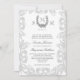 Vacker, sofistikerad, grå och vit vintage-ekollon bröllopsinbjudan med monogram-initialer. En kunglig, traditionell bröllopsinbjudan med vintage-konstverk av en ekollon med en slinga och band. Elke Clarke© för Monogram Gallery. För andra färger, vänligen kontakta designern.