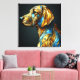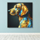 En porträtt som fångar upp hund huvud i en snyggt mot en mörk bakgrund. Den här nedfläckaden av abstrakt har en palett med blått, turkos, gult, orange och gyllene nyanser. Konstnärliga struktur och färg skapar en levande och elegant bild av vår älskade fyralegerade vän.