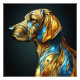En porträtt som fångar upp hund huvud i en snyggt mot en mörk bakgrund. Den här nedfläckaden av abstrakt har en palett med blått, turkos, gult, orange och gyllene nyanser. Konstnärliga struktur och färg skapar en levande och elegant bild av vår älskade fyralegerade vän.