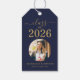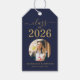 Lägg till en polerad finish på dina presenter med dessa Grad Foto Klass 2026 Blå & Guld Script Examen Presentmärken. Med en rik blå design med elegant guldskrift och ditt anpassade foto, ger dessa märken en personlig och sofistikerad look till alla examensfirande.
